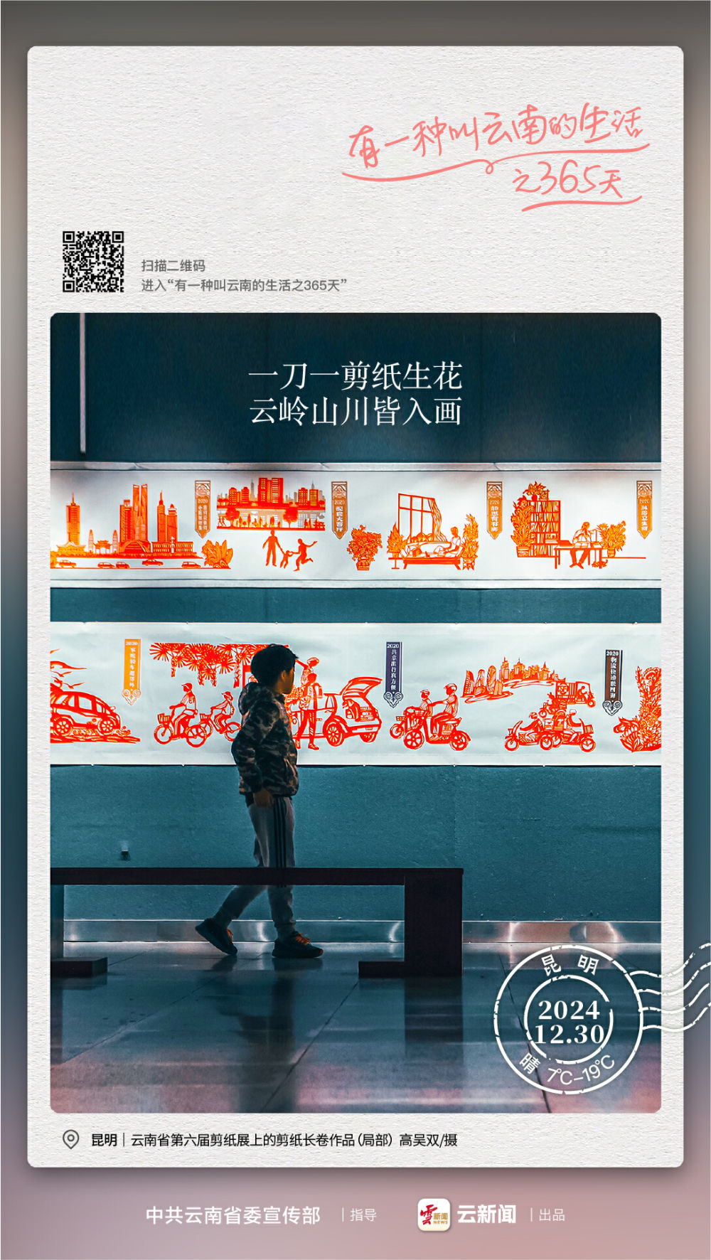 本次展覽還特邀7位剪紙藝術(shù)家從“衣、食、住、行、樂(lè)”五個(gè)方面集體創(chuàng)作了剪紙長(zhǎng)卷,以人民群眾生活品質(zhì)的提升嬗變,反映云南高質(zhì)量跨越式發(fā)展的新成就,充分展現(xiàn)邊疆各族兒女一心向黨、攜手共圓中國(guó)夢(mèng)的時(shí)代新氣象。