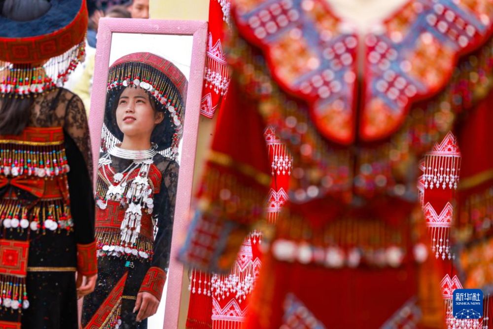 ??1月19日,在云南省紅河哈尼族彝族自治州開遠市的苗族集市上,少數(shù)民族群眾在試穿新衣。