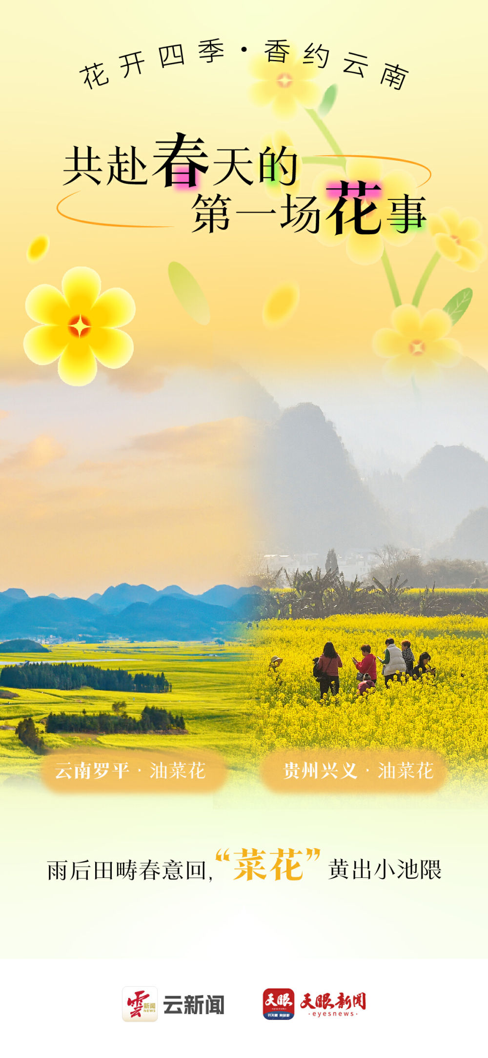 此時此刻,云南羅平與貴州萬峰林的油菜花,已逐漸“蘇醒”,朝著更加壯觀的姿態(tài)綻放。一片片金黃色的花海,仿佛金色的海洋,與藍天白云交相輝映,構成了一幅幅動人的畫卷。在這里,你可以感受到春天的熱情與活力,仿佛整個世界都被這份金色所感染。