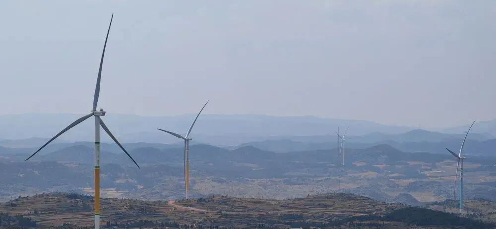 位于曲靖市富源縣的國(guó)電投富源西風(fēng)電場(chǎng),幾臺(tái)風(fēng)機(jī)正在運(yùn)轉(zhuǎn)。浦超 攝