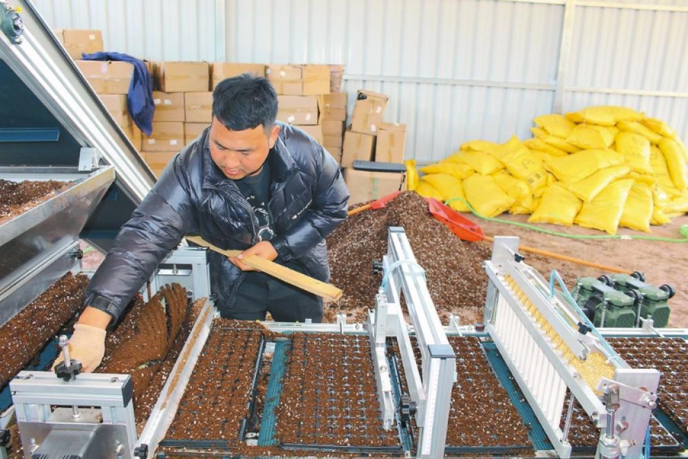 放盤、添土、加種,短短幾秒,一盤整齊的苗盤便傳送到工人手中。在漾濞彝族自治縣龍?zhí)多l(xiāng)己路河村辣椒育苗基地,一臺(tái)嶄新的全自動(dòng)播種育苗機(jī)正在高效運(yùn)轉(zhuǎn)。