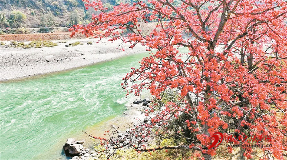日出江花紅勝火,春來江水綠如藍。近日,隨著幾場春雨無聲的滋潤,怒江畔,火紅的木棉花次第盛開,如同燃燒的火焰,點亮了怒江大峽谷的春色。