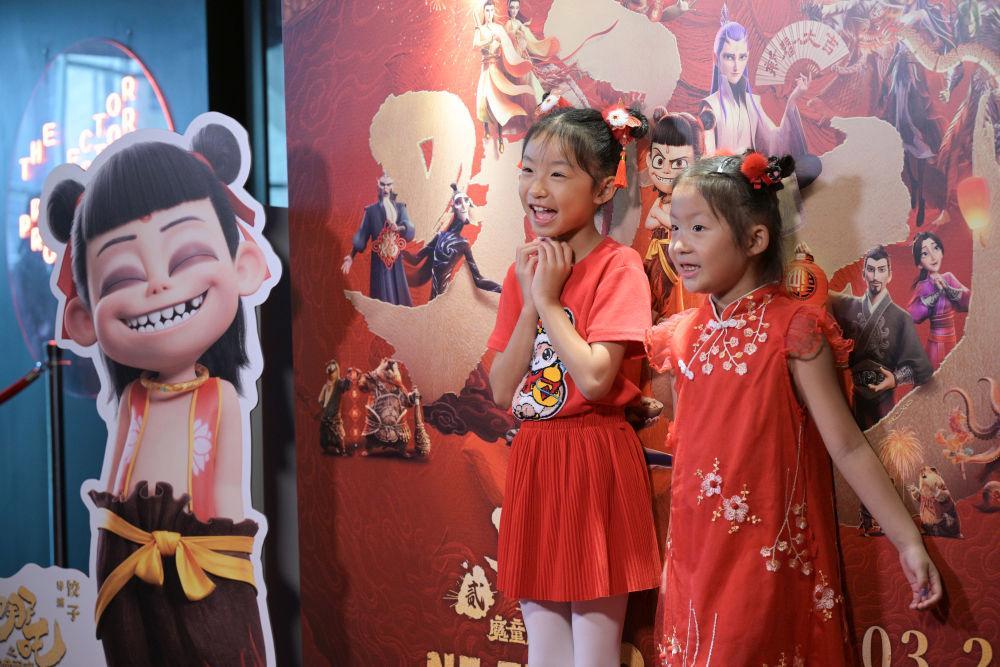 2025年3月2日,兩名小朋友參加電影《哪吒之魔童鬧?!沸录悠率子扯Y。新華社發(fā)(鄧智煒攝)