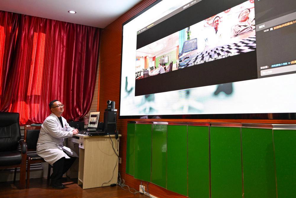 2024年12月17日,在青海省海南藏族自治州共和縣中醫(yī)院,醫(yī)生與鄉(xiāng)鎮(zhèn)衛(wèi)生院連線進(jìn)行遠(yuǎn)程會診。新華社記者 張龍 攝