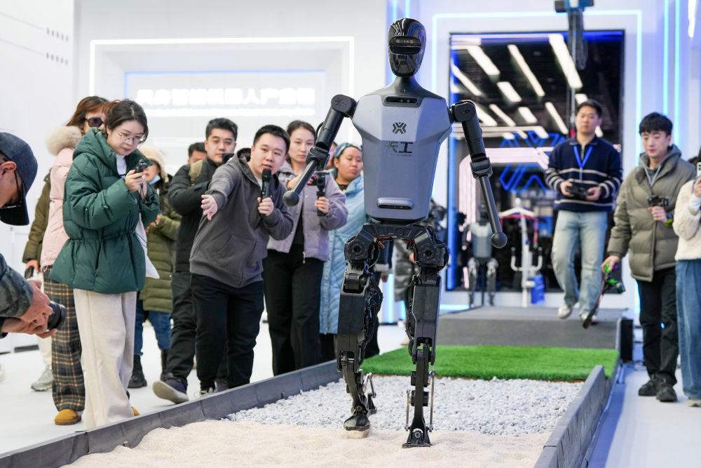 2025年2月24日,參觀者在北京“機(jī)器人大世界”參觀人形機(jī)器人“天工”行進(jìn)展示。新華社記者 鞠煥宗 攝