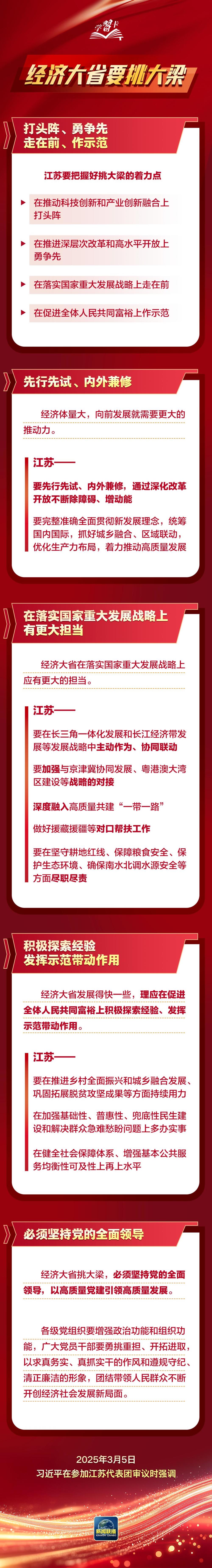 3月5日下午,習(xí)近平總書記參加十四屆全國(guó)人大三次會(huì)議江蘇代表團(tuán)審議。他強(qiáng)調(diào),圓滿實(shí)現(xiàn)“十四五”發(fā)展目標(biāo),經(jīng)濟(jì)大省要挑大梁。希望江蘇落實(shí)好挑大梁的責(zé)任,努力取得新的更大成績(jī)。如何理解“經(jīng)濟(jì)大省要挑大梁”?要落實(shí)哪些責(zé)任?總書記作了深刻闡釋,一起學(xué)習(xí)↓