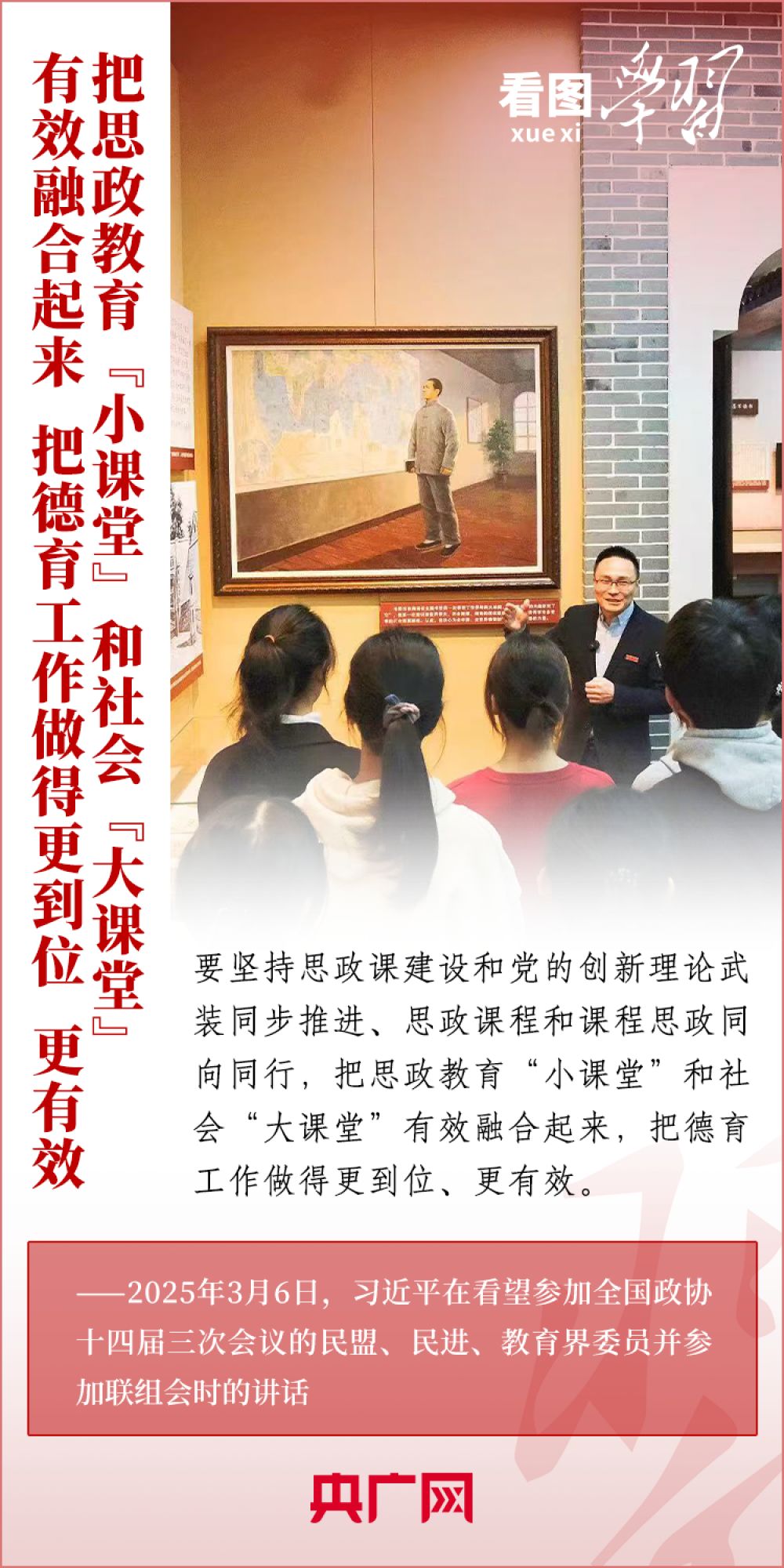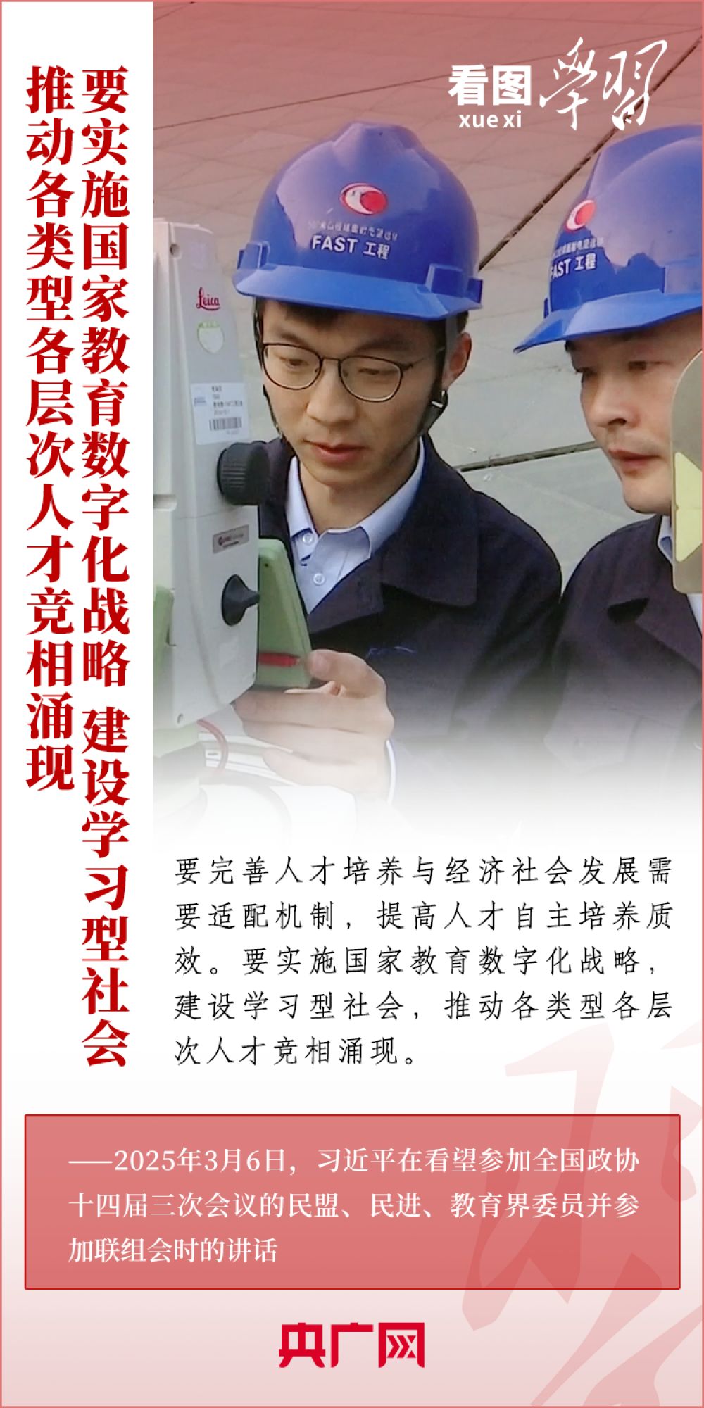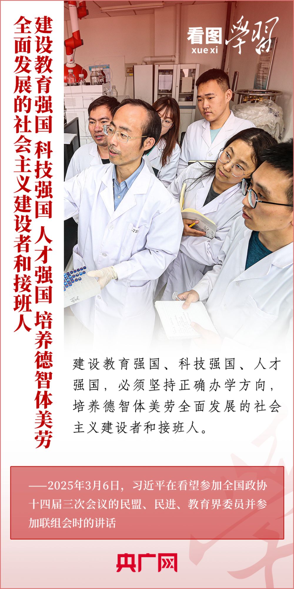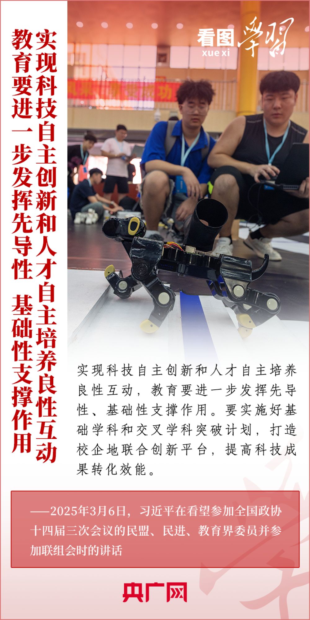 “建設(shè)教育強(qiáng)國、科技強(qiáng)國、人才強(qiáng)國,是全黨全社會的共同責(zé)任?!?月6日,習(xí)近平總書記在看望參加全國政協(xié)十四屆三次會議的民盟、民進(jìn)、教育界委員并參加聯(lián)組會時發(fā)表重要講話??倳浘妥龊媒逃⒖萍?、人才工作作出深刻闡釋,強(qiáng)調(diào)必須深刻把握中國式現(xiàn)代化對教育、科技、人才的需求,強(qiáng)化教育對科技和人才的支撐作用,進(jìn)一步形成人才輩出、人盡其才、才盡其用的生動局面。一起來學(xué)習(xí)!