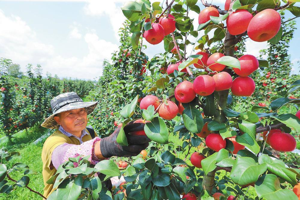 農(nóng)戶在采摘第二代紅梨“彩云紅”。云南日報記者 楊崢 攝