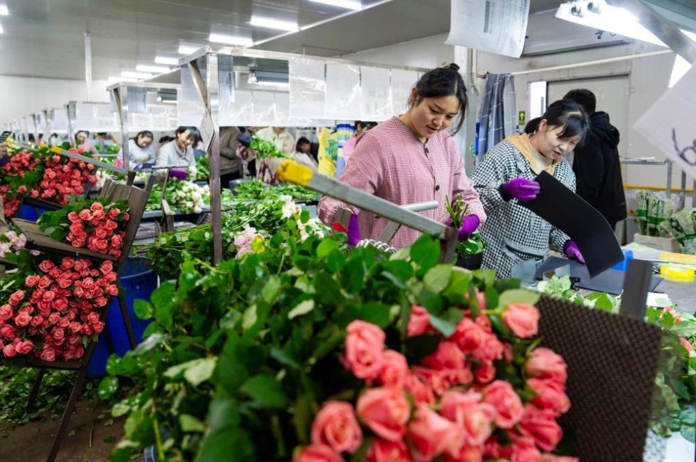 近日,花農(nóng)在分揀包裝車間內(nèi)包裝鮮花。新華社記者 陳欣波 攝