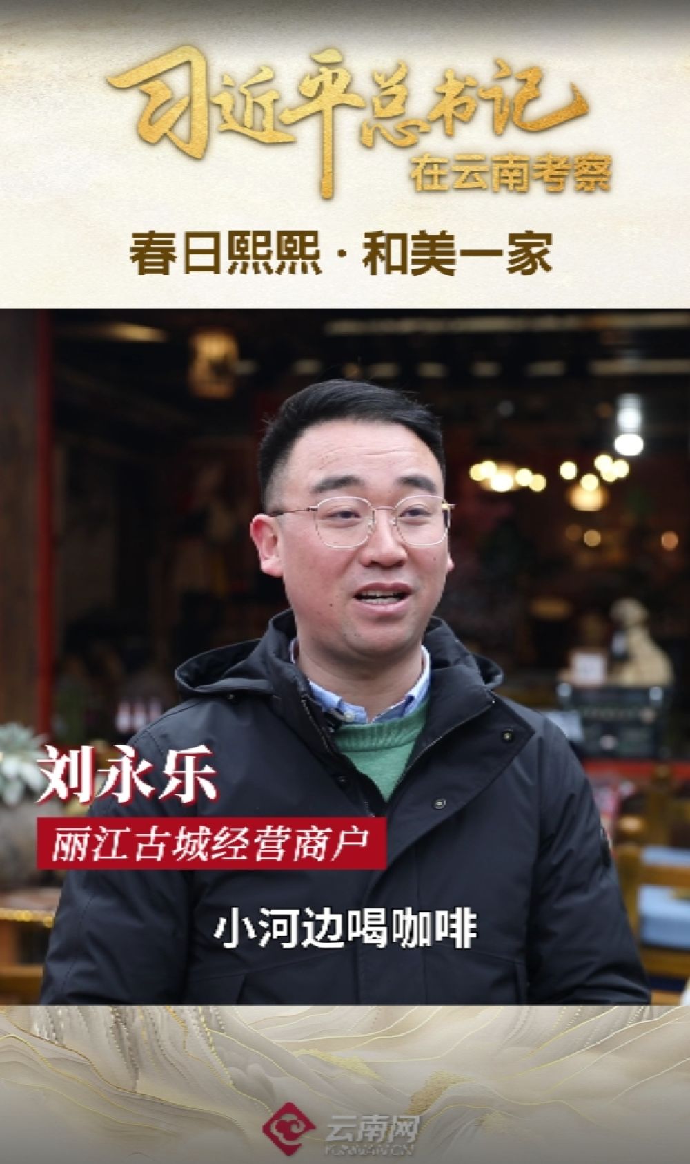 2025年3月19日下午,習(xí)近平總書記在云南麗江市考察調(diào)研,麗江古城經(jīng)營商戶劉永樂熱情邀請總書記品嘗云南小粒咖啡。