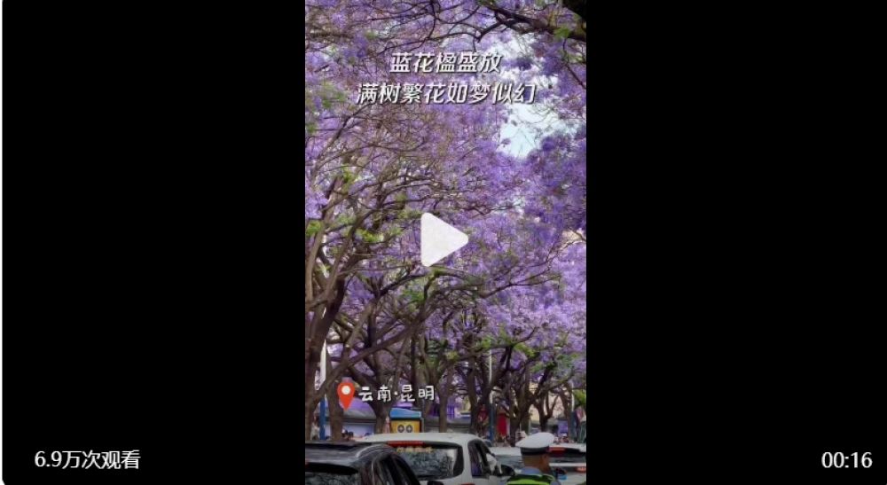 五月的云南昆明,紫色的藍花楹熱烈綻放,點綴在大街小巷。滿樹繁花鮮艷耀眼,如夢如幻,陽光透過花瓣灑落斑駁光影,隨手一拍就是大片?。ㄈ嗣窬W)