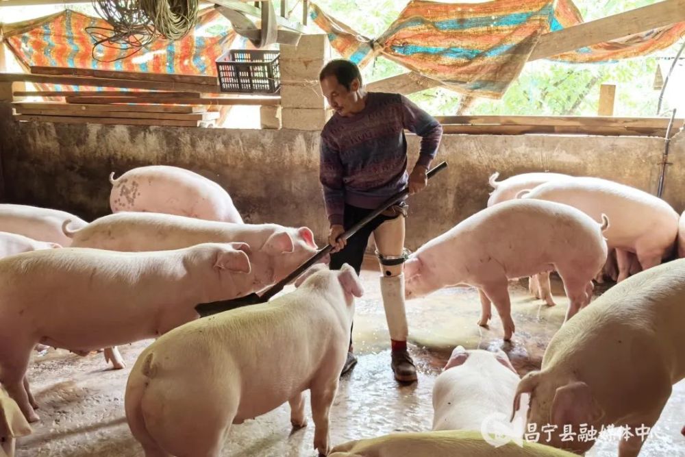 天剛破曉,更戛鄉(xiāng)荒田村的山巒還籠罩在薄霧中,180多頭生豬的歡騰叫聲已穿透晨霧?,F(xiàn)年57歲的高鼎戴著假肢,正熟練地將拌好的飼料倒入食槽,金屬假肢與水泥地面碰撞出“嗒嗒”的節(jié)奏,成為他每天勞作的開場曲。這位曾因肢體殘疾陷入迷茫的農(nóng)村漢子,用11年時(shí)間在群山環(huán)抱的“山咔咔”里,譜寫出一曲震撼人心的自強(qiáng)之歌。