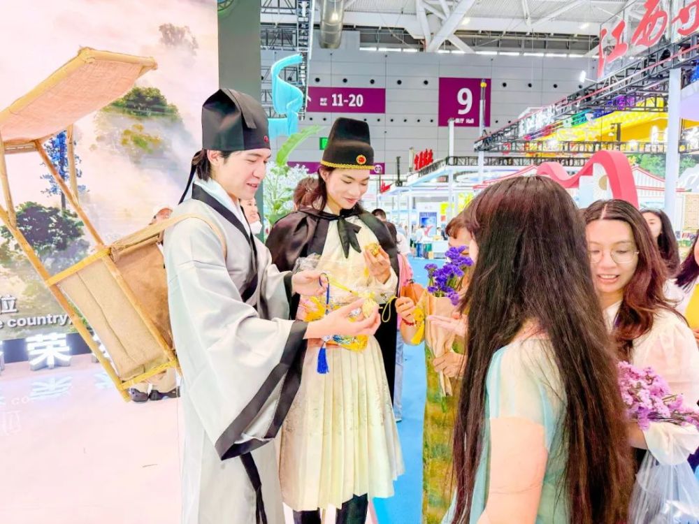 在新增的“霞客行之江山多嬌”“鄭和行之友誼使者”兩大主題展區(qū)附近,亦能看到兩位扮演者身著古裝穿越到現(xiàn)場,贈送香囊與游客互動;