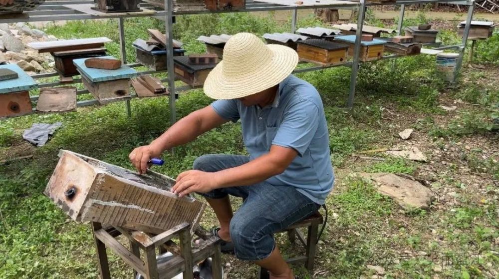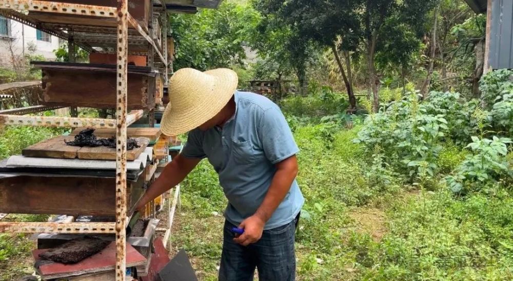 楊生進向傈僳族老鄉(xiāng)虛心求教,從他們手中收購蜂群為他們筑造“新家”。黃腹酸蜂體型微小,多在樹洞、石洞等隱蔽之處筑巢,這也為人工養(yǎng)殖增添了不少難度。起初,因缺乏經驗的他遭遇過蜂群獲取難度大、逃逸、存活率低等重重困境。為了開啟黃腹酸蜂的人工養(yǎng)殖之路,他日夜觀察記錄蜂群習性,尋找合適的樹干構筑箱子,反復調整養(yǎng)殖方法,在一次次失敗中總結經驗,調整養(yǎng)殖策略。功夫不負有心人,經過6年的精心照料與不懈努力,他掌握了黃腹酸蜂養(yǎng)殖訣竅,養(yǎng)殖規(guī)模逐步擴大,從最初的幾群發(fā)展到如今的一百多群,產蜜約60公斤。看著這些勤勞的小精靈在蜂箱間忙碌穿梭,楊生進臉上洋溢著欣慰的笑容。