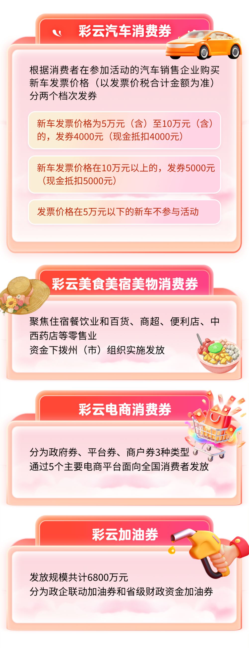 自5月28日起至今年年底,云南以“旅居云南 惠聚時光”為主題,聚焦零售、住宿、餐飲、汽車、電商、成品油、電影等核心消費場景,推出“有一種叫云南的生活·彩云系列消費券”,發(fā)券規(guī)模超過10億元,為云南近5年來消費券發(fā)放資金規(guī)模之最。此次發(fā)放的消費券包括彩云汽車消費券、彩云美食美宿美物消費券、彩云電商消費券和彩云加油券等類型。