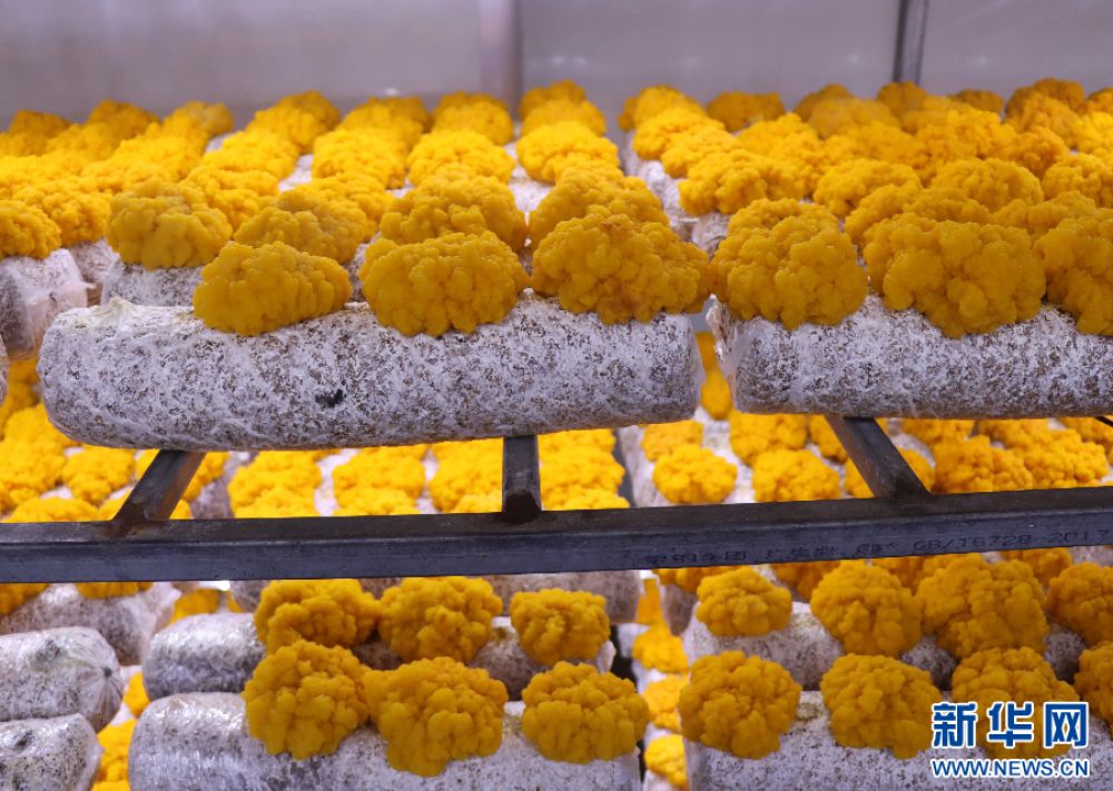 ??在昆明市嵩明縣,云南菌視界生物科技有限公司的現(xiàn)代化菇房里,一排排菌包有序陳列,“黃金花”般的金耳在人工營造的適宜環(huán)境中生長。