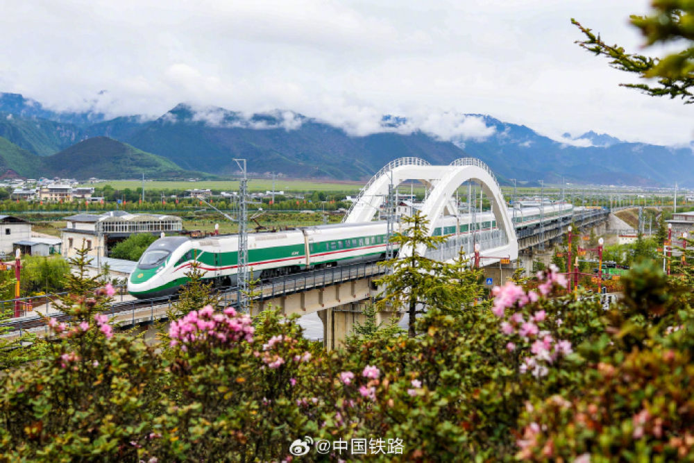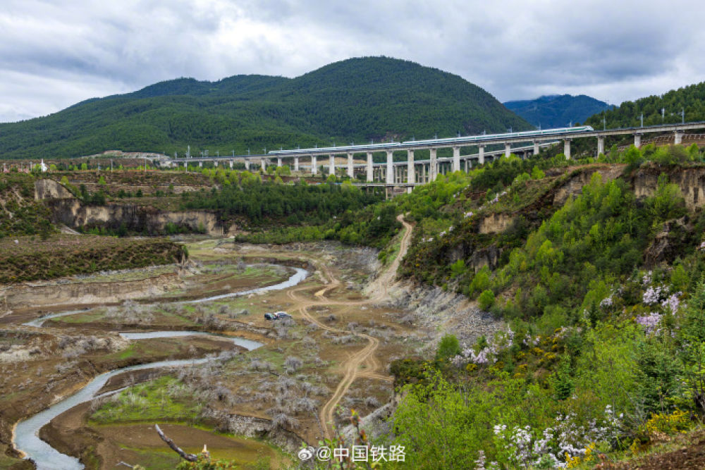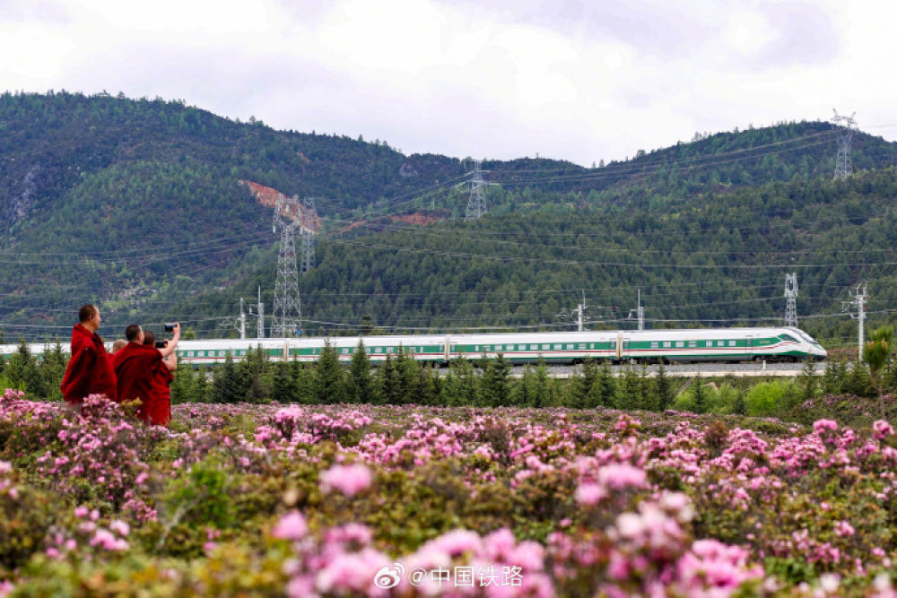 在香格里拉的如畫景致中,漫山遍野的高山杜鵑熱烈綻放,粉紫花朵交織成絢爛花毯。一列復(fù)興號動(dòng)車組宛如銀龍,在青山綠樹間穿行而過,現(xiàn)代交通的速度與自然美景完美融合,奏響一曲動(dòng)人心弦的時(shí)代樂章。