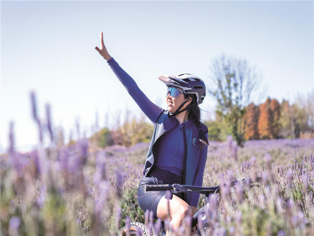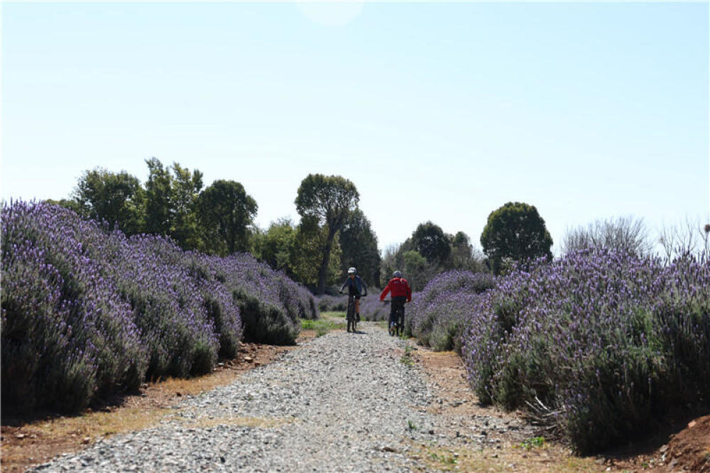 騎行愛(ài)好者在滇池綠道薰衣草莊園打卡