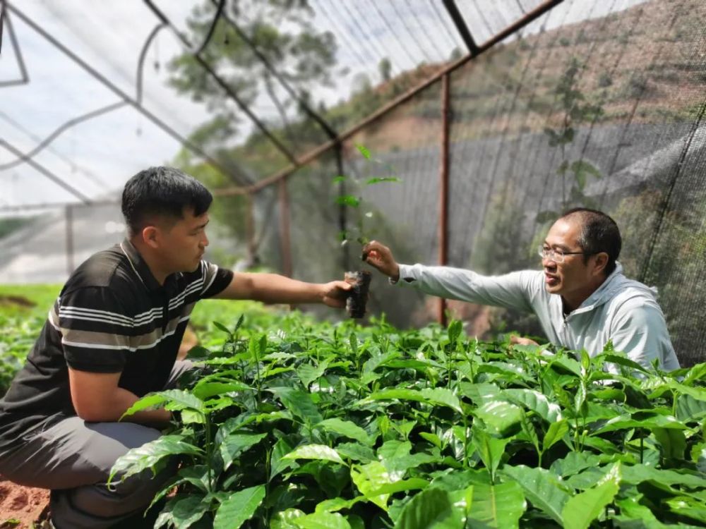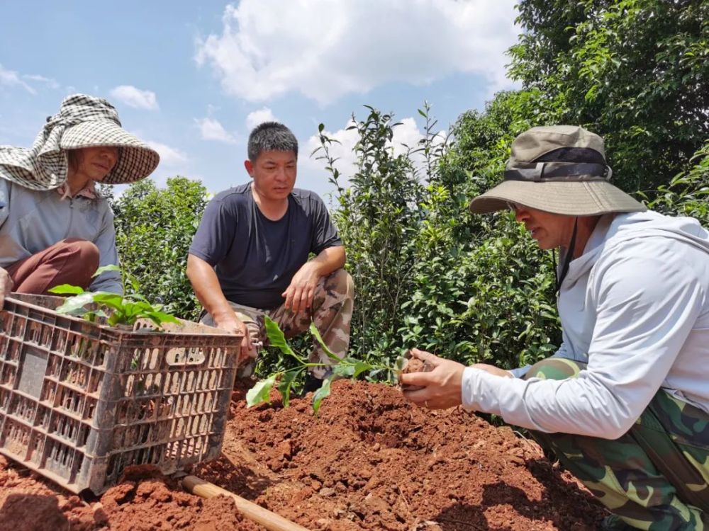在種植基地,咖農(nóng)搶抓有利天氣進行咖啡苗定植,咖啡技術員指導農(nóng)戶進行合理套種,既可為咖啡樹生長提供覆蔭條件,又能有力提升土地利用效率,提高農(nóng)民收益。