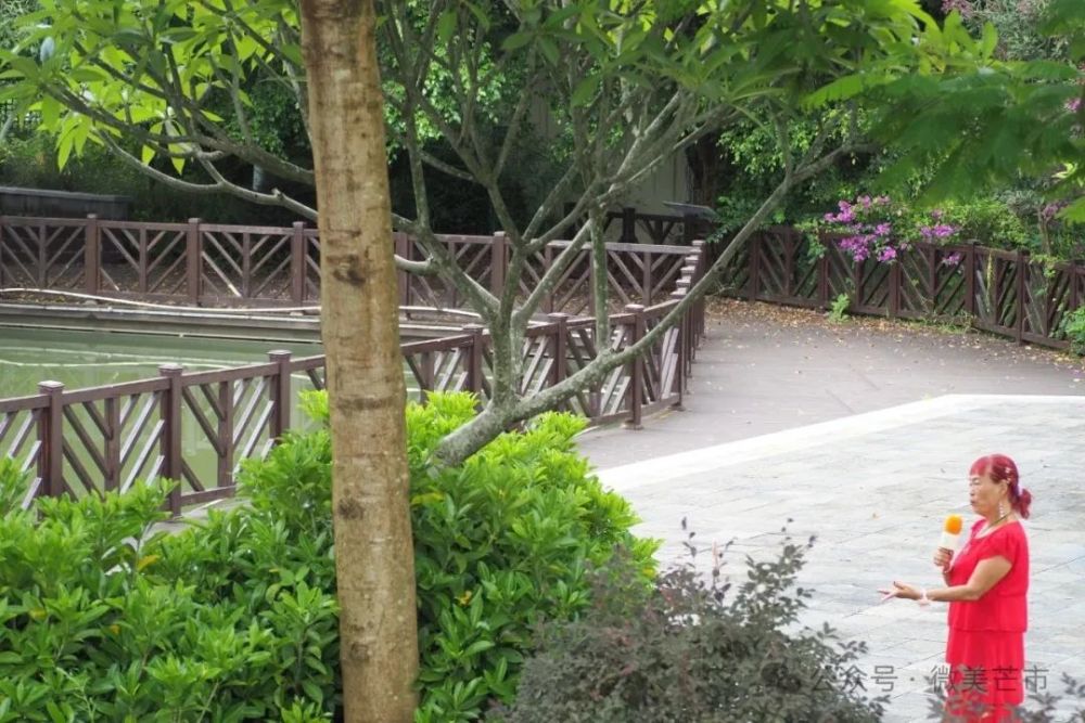 涼亭下有人支起手機直播,打鼓的、跳舞的、拍視頻的、閑坐的……皆能在此安放身心。