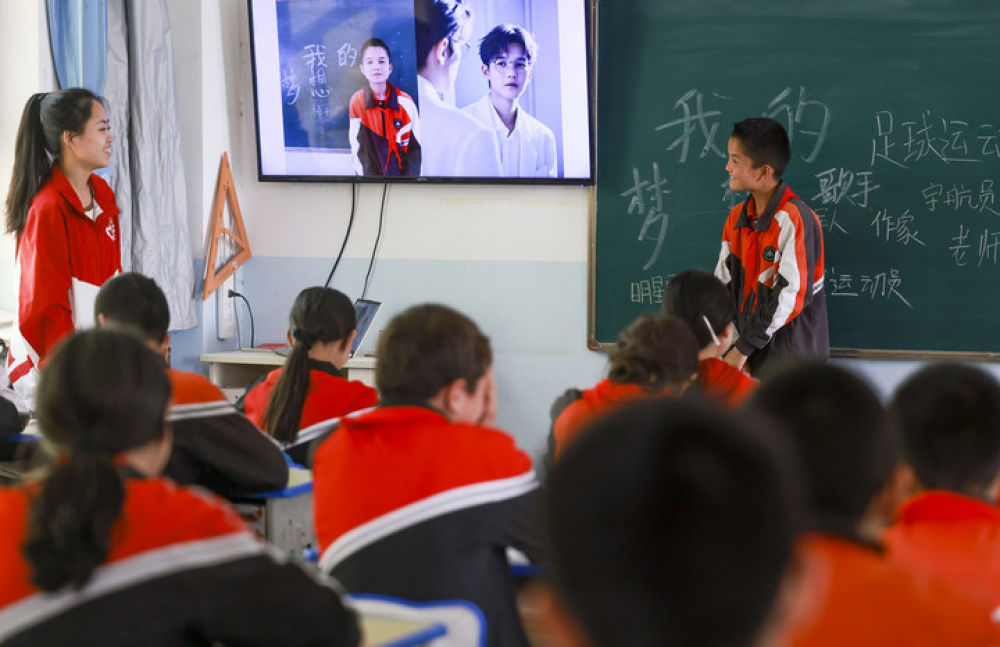 新疆克孜勒蘇柯?tīng)柨俗巫灾沃莅D什市哈拉峻鄉(xiāng)謝依特小學(xué),是一所主要面向柯?tīng)柨俗巫鍖W(xué)生的村級(jí)小學(xué),2022年8月成為該州首個(gè)西部計(jì)劃志愿者包校支教的試點(diǎn)學(xué)校。23名戍邊支教西部計(jì)劃志愿者服務(wù)隊(duì)的志愿者,在這所小學(xué)承擔(dān)著教書育人的工作。經(jīng)過(guò)近三年的支教服務(wù),學(xué)生的學(xué)習(xí)成績(jī)顯著提高,得到當(dāng)?shù)貜V泛認(rèn)可。這是2025年4月23日,支教教師高淑賢(左一)在班級(jí)里展示她為學(xué)生們制作的“AI夢(mèng)想職業(yè)照”。