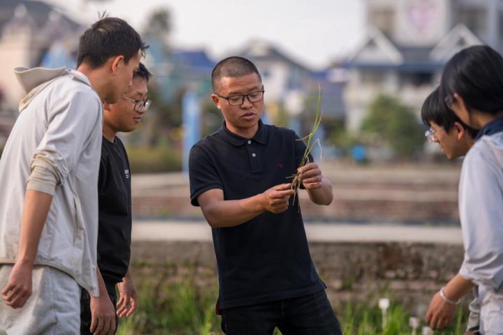 今年37歲的黃光福是云南大學(xué)農(nóng)學(xué)院的一名青年教師,同時(shí)也是云南大學(xué)在云南省勐??h勐遮鎮(zhèn)曼恩村成立的多年生稻科技小院的負(fù)責(zé)人。多年來(lái),他帶領(lǐng)學(xué)生扎根田間,進(jìn)行技術(shù)攻關(guān)。團(tuán)隊(duì)利用長(zhǎng)雄野生稻特有的地下莖無(wú)性繁殖能力,成功培育出“云大25”“云大107”等新品種,突破性地實(shí)現(xiàn)水稻“一次栽種、連續(xù)收割”,讓“割韭菜般收稻子”的農(nóng)業(yè)成果從實(shí)驗(yàn)室走向田間地頭。這是2025年2月27日,青年教師黃光福(中)在試驗(yàn)田間給學(xué)生授課。