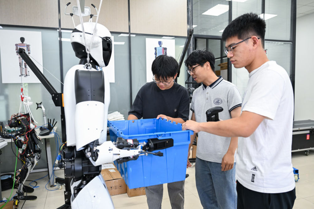 近年來(lái),湖北省加快布局人形機(jī)器人領(lǐng)域,依托省內(nèi)高校院所的人才優(yōu)勢(shì)和創(chuàng)新體系優(yōu)勢(shì),組織武漢大學(xué)、華中科技大學(xué)等參與人形機(jī)器人相關(guān)項(xiàng)目研發(fā),集中推出“天問(wèn)”“勞動(dòng)者”“荊楚”等一系列人形機(jī)器人。這是2025年5月29日,在華中科技大學(xué)機(jī)械科學(xué)與工程學(xué)院,博士研究生丁濤(右二)和團(tuán)隊(duì)成員測(cè)試“荊楚”人形機(jī)器人的搬運(yùn)能力。