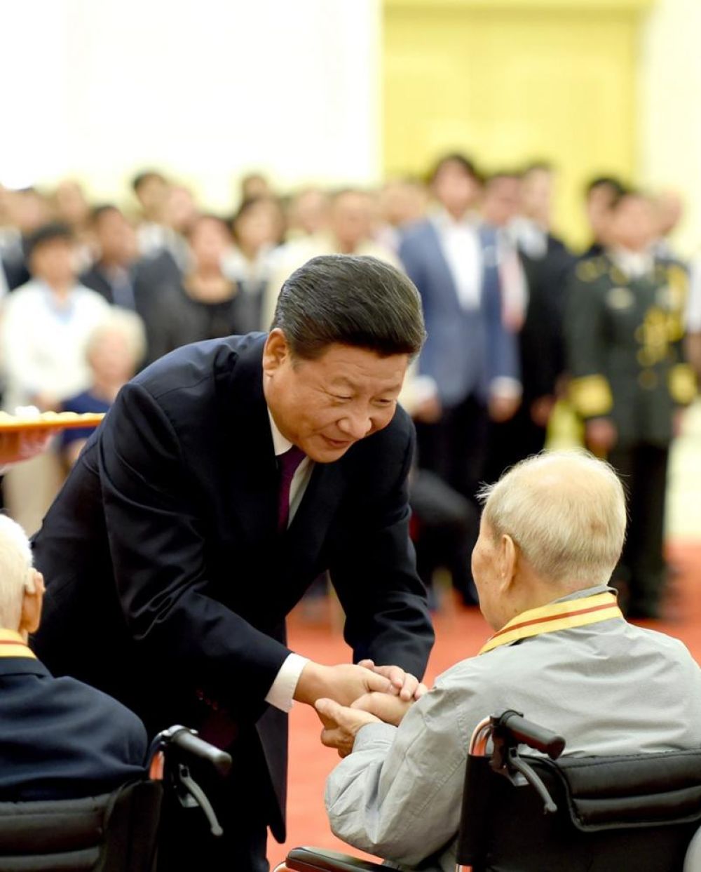 2015年9月2日,人民大會(huì)堂金色大廳,莊嚴(yán)的典禮在這里舉行。30名抗戰(zhàn)老戰(zhàn)士老同志、抗戰(zhàn)將領(lǐng)、幫助和支持中國抗戰(zhàn)的國際友人或其遺屬代表,接受習(xí)近平總書記頒發(fā)的“中國人民抗日戰(zhàn)爭勝利70周年紀(jì)念章”。