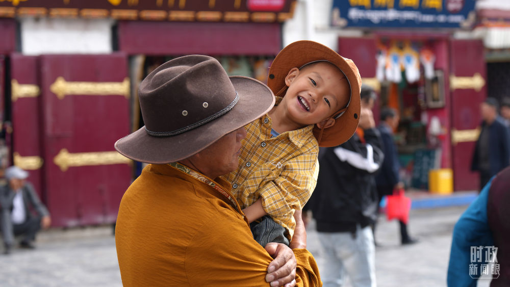 △拉薩八廓街上的溫馨一幕。(總臺(tái)記者李晉拍攝)