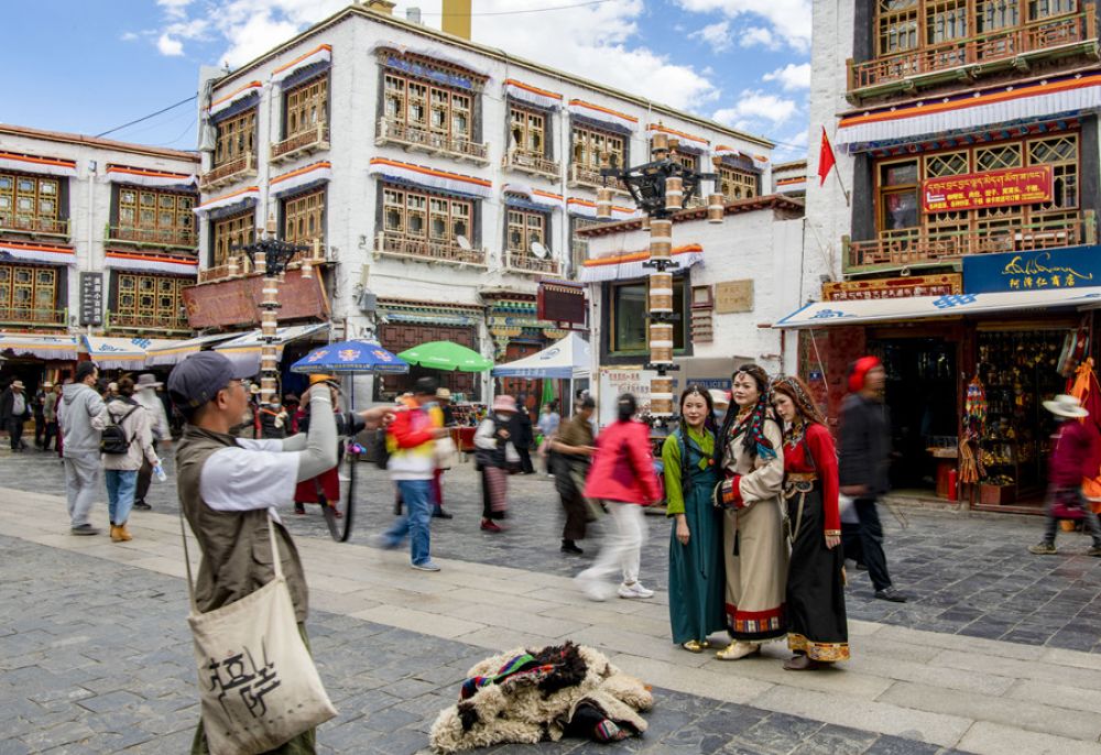 ??游客身著藏裝在拉薩八廓街拍照留念(2023年6月13日攝)。新華社記者 姜帆 攝