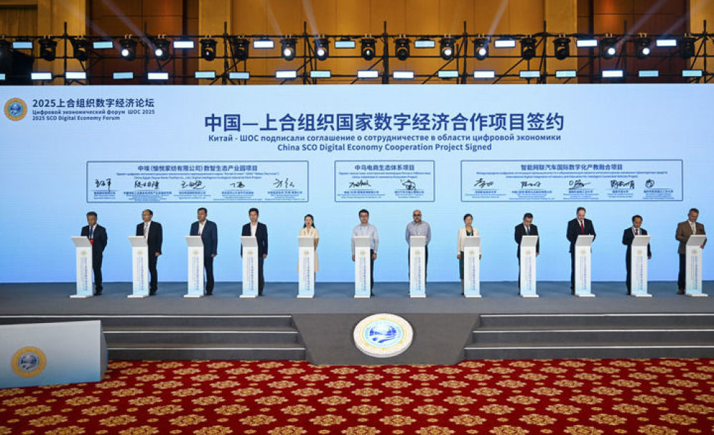 ??在2025上合組織數(shù)字經(jīng)濟(jì)論壇上,中國—上合組織國家數(shù)字經(jīng)濟(jì)合作項(xiàng)目進(jìn)行簽約(2025年7月11日攝)。新華社記者 趙子碩 攝