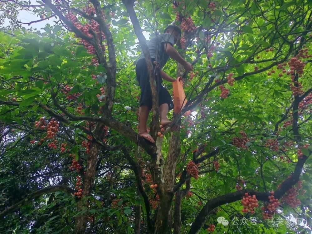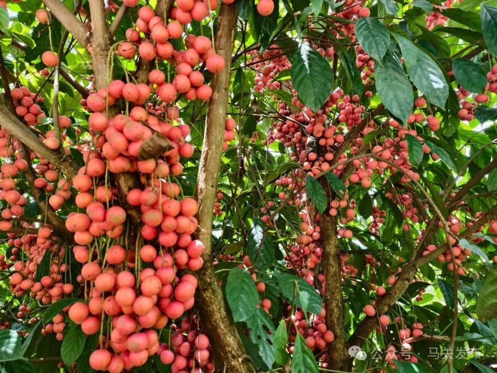 沿著都龍鎮(zhèn)蜿蜒盤旋的山路前行,在辣子寨南松村的寬地間,便能見到米湯果的身影。高大的果樹上,一串串紅色果實從樹梢垂到樹干,密密麻麻綴滿枝頭——遠(yuǎn)看如鮮翠欲滴的荔枝,近觀似堆堆鮮紅的葡萄,誘人的模樣讓人不禁想伸手采摘。