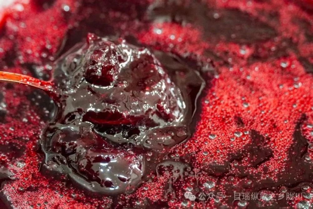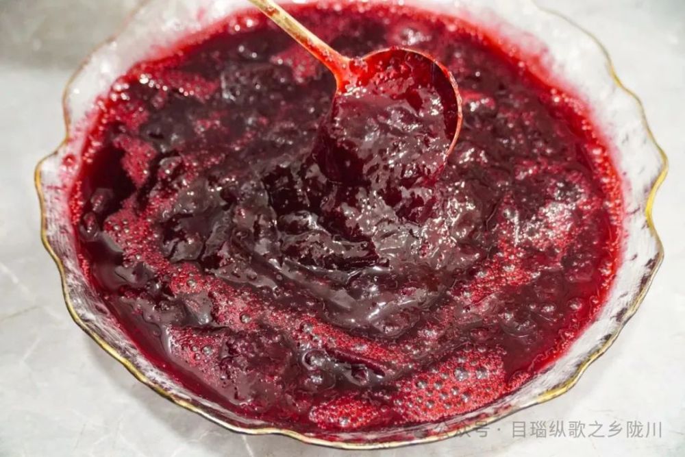 隴川人對(duì)胭脂果的愛,都藏在吃法里。最經(jīng)典的當(dāng)屬辣椒鹽涼拌,新鮮果子拌上調(diào)料,酸辣中裹著果香,一口下去是獨(dú)屬于隴川的鮮活滋味。但胭脂果賞味期太短,機(jī)靈的當(dāng)?shù)厝嗽缬小袄m(xù)命” 妙招 —— 熬成果醬。