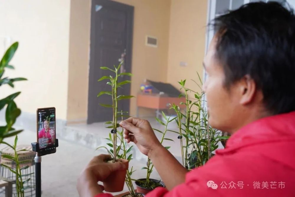 石斛花種植和直播讓楊榮成在家就解決了生計問題,家里的老人和孩子也不用再留守。他家的庭院是鄉(xiāng)里首批“樣板房”之一。政府引入企業(yè)力量,墊付3000盆優(yōu)質(zhì)石斛蘭苗、無償提供花架農(nóng)資、每月技術(shù)員上門指導。村委會成立合作社與企業(yè)簽訂協(xié)議兜底銷路。鄉(xiāng)政府更積極引入電商賦能,組織直播培訓,手把手教農(nóng)戶在抖音、快手上開拓銷路。