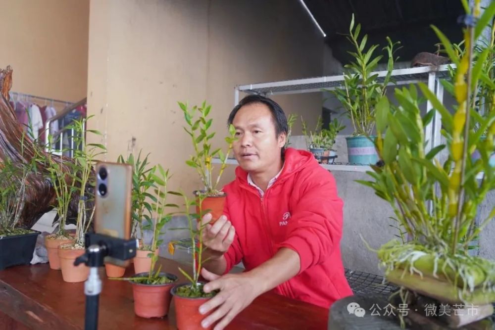 在芒市江東鄉(xiāng)李子坪村,村民楊榮成家的庭院里,各式石斛花開得正盛。面對直播鏡頭,他從容地向觀眾介紹:“這個是梵凈山石斛,你就不用擔心把它種死,主播這邊已經(jīng)種植成活了?!彼N售的觀賞石斛,正是村里“石斛花庭院經(jīng)濟”的鮮活產(chǎn)品。