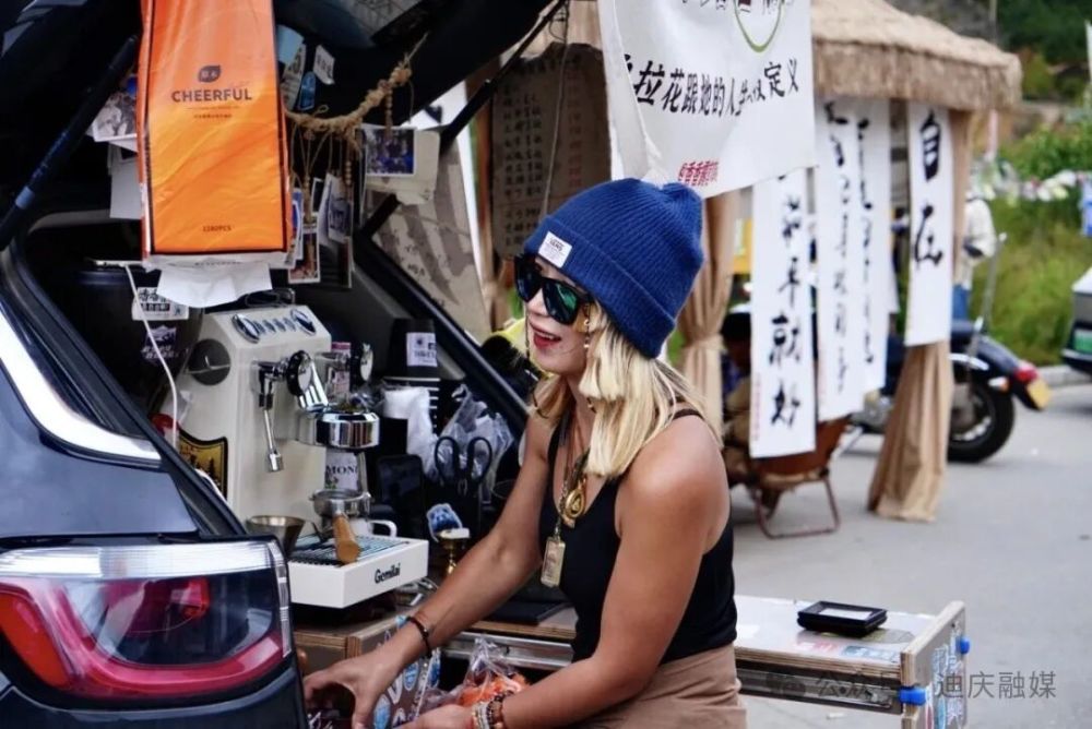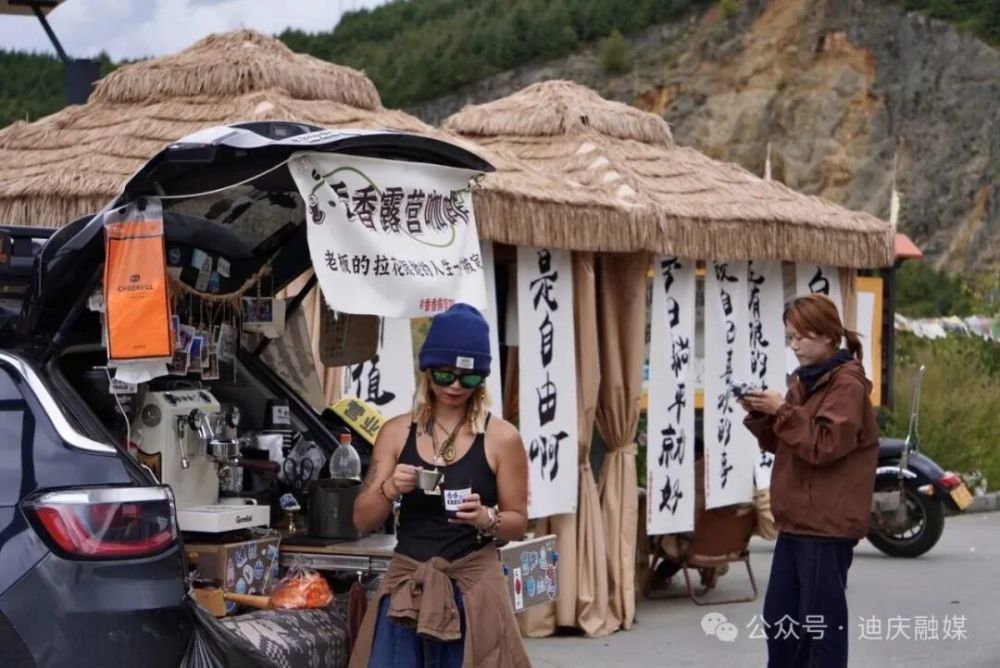 從214國道遠眺,松贊林寺的金頂在陽光下熠熠生輝。觀景臺上,一座稻草扎頂?shù)穆稜I帳篷旁,咖啡機蒸騰著白霧,90后成都姑娘范興香手指翻飛,磨豆、壓粉、萃取,整套動作行云流水。