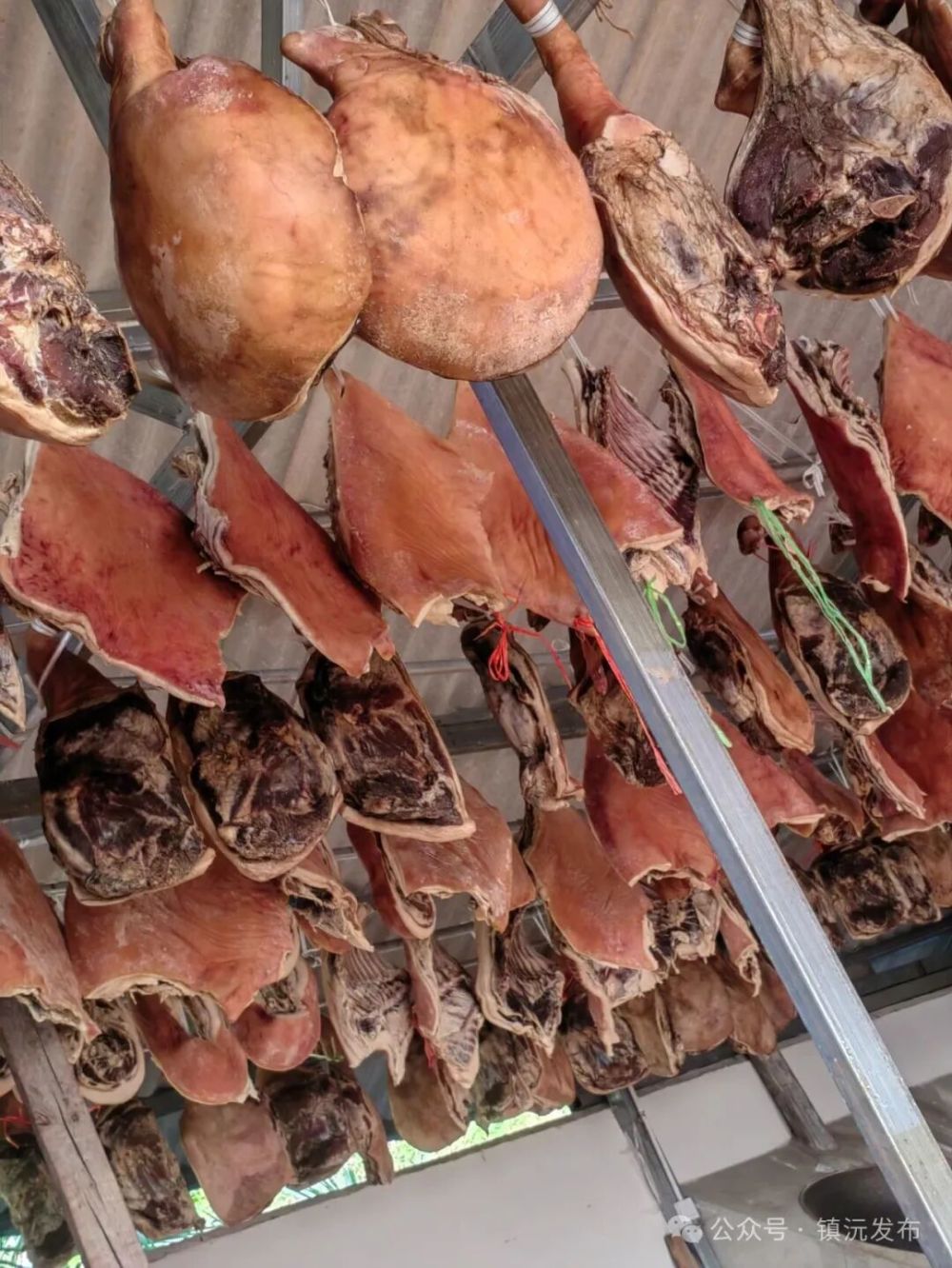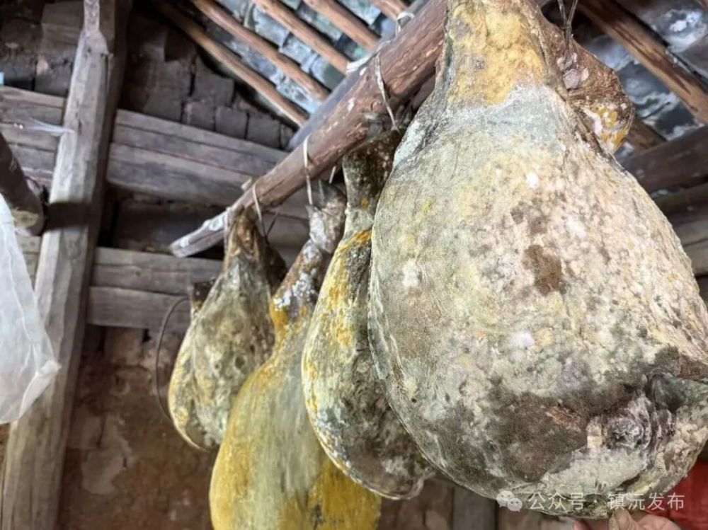 腌好的豬腿,要移到特有的木屋里風(fēng)干。木屋通風(fēng)又干燥,房梁上掛得滿滿當(dāng)當(dāng)?shù)幕鹜?,像一件件等待時(shí)光打磨的藝術(shù)品。陽(yáng)光從木屋的窗欞里斜射進(jìn)來(lái),落在火腿表面,能看到表皮慢慢收緊,偶爾有晶瑩的油脂順著肉紋往下滴。村民們每天都會(huì)來(lái)木屋看看,摸摸火腿的硬度,聞聞空氣中的香氣——那是肉質(zhì)在自然發(fā)酵中,慢慢醞釀出的鮮香,混著山林里草木的清味。