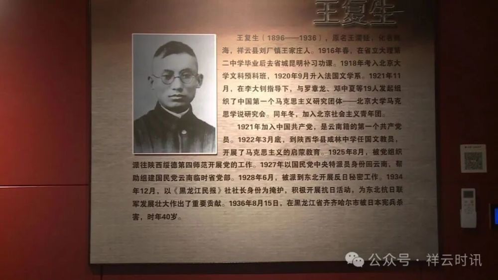 1896年,王復(fù)生出生在祥云縣劉廠鎮(zhèn)王家莊村。1918年,王復(fù)生以優(yōu)異成績(jī)考入北京大學(xué),1921年加入中國(guó)共產(chǎn)黨,是云南籍的第一位共產(chǎn)黨員。