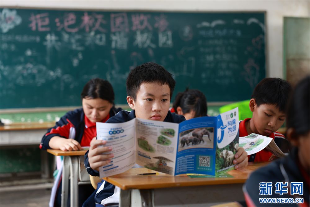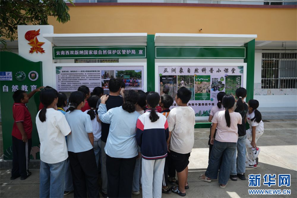 關(guān)坪小學(xué)的師生觀看亞洲象知識宣傳展板(6月26日攝)。新華網(wǎng)發(fā)