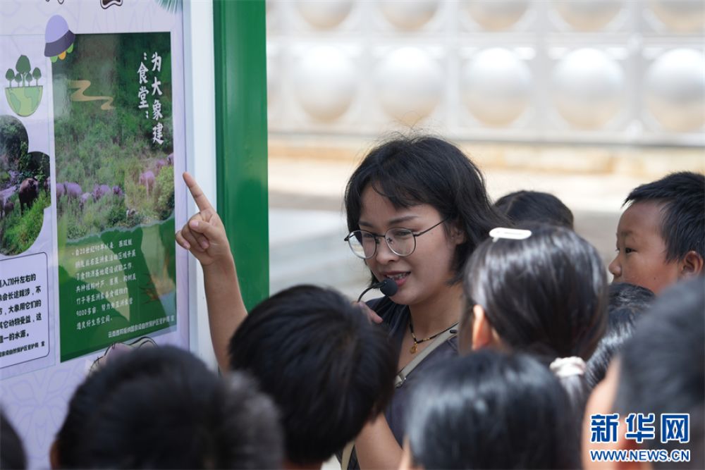 普麗香正在給學(xué)生們科普亞洲象相關(guān)知識(6月25日攝)。新華網(wǎng)發(fā)