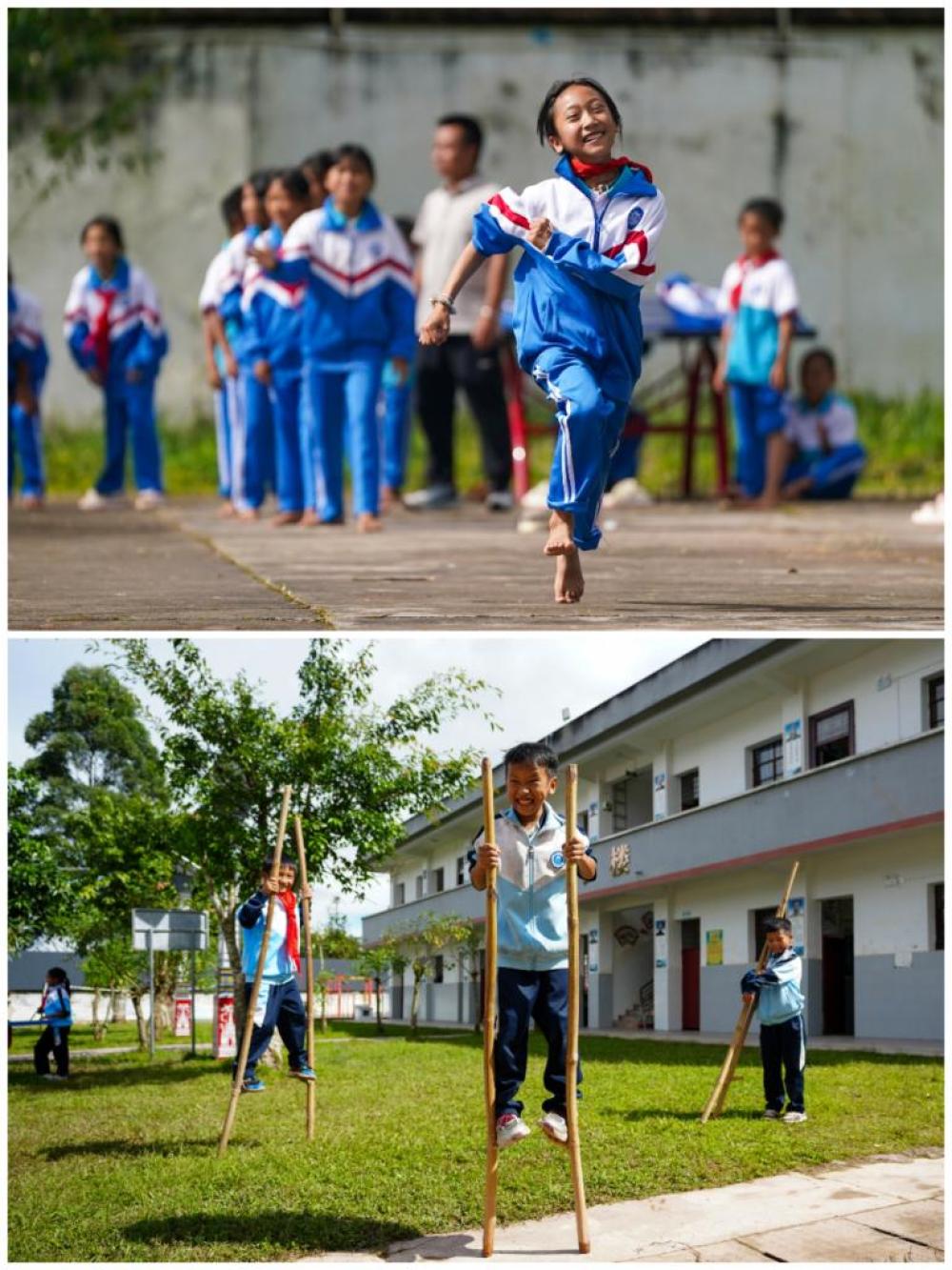 ??課后,臘福小學(xué)的孩子在接力(上)。戈的小學(xué)的孩子在踩高蹺(下)。新華社記者陳欣波 攝