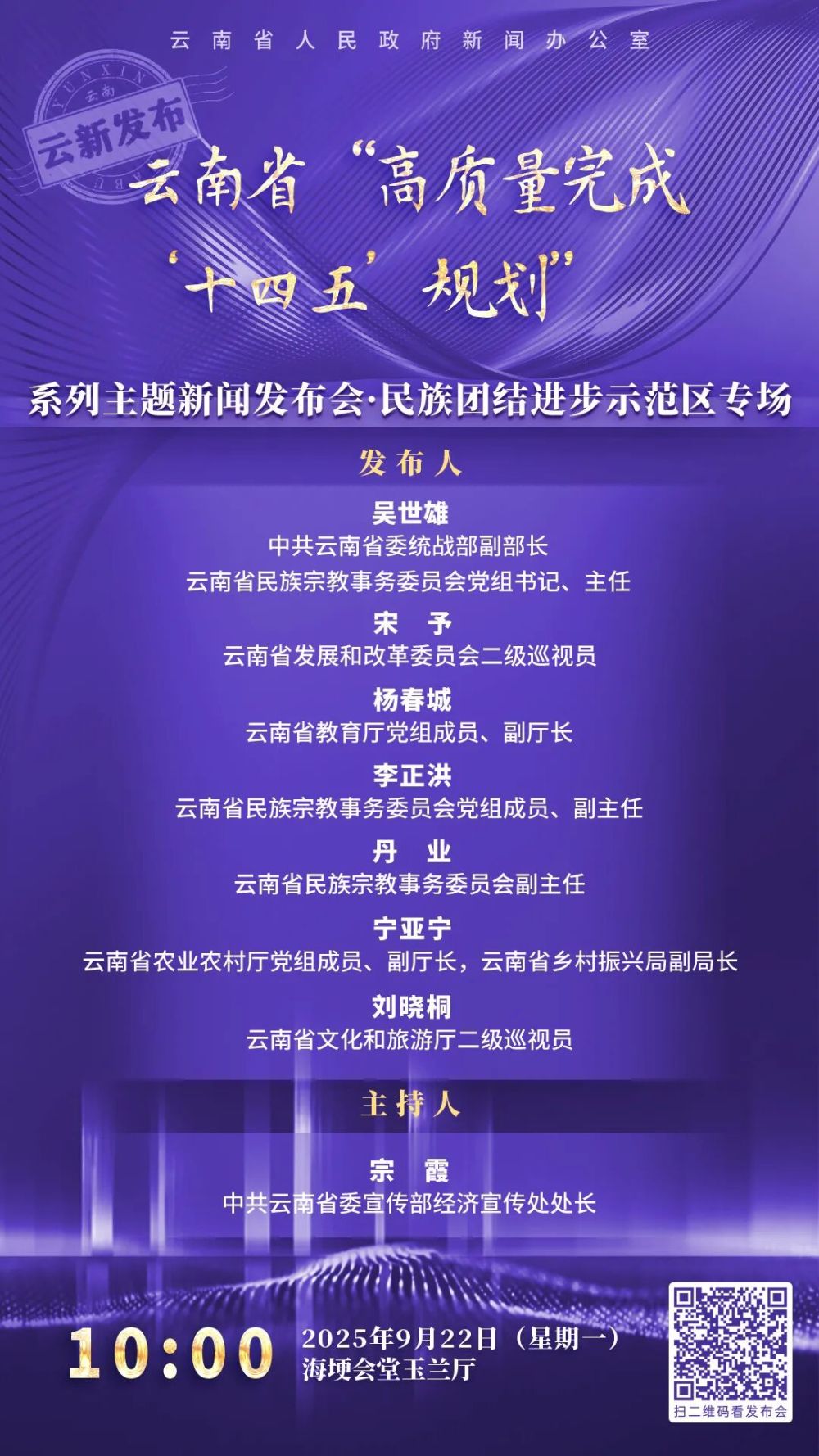 9月22日上午,云南省人民政府新聞辦公室在云南海埂會堂舉行云南省“高質(zhì)量完成‘十四五’規(guī)劃”系列主題新聞發(fā)布會·民族團(tuán)結(jié)進(jìn)步示范區(qū)專場,介紹“十四五”期間云南建設(shè)我國民族團(tuán)結(jié)進(jìn)步示范區(qū)有關(guān)工作情況并答記者問。