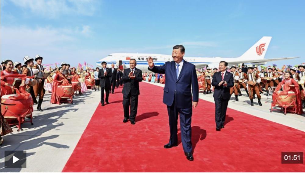 新疆維吾爾自治區(qū)黨委書記陳小江、自治區(qū)人民政府主席艾爾肯·吐尼亞孜、自治區(qū)人大常委會主任祖木熱提·吾布力、自治區(qū)政協(xié)主席努爾蘭·阿不都滿金、新疆生產(chǎn)建設(shè)兵團(tuán)政委何忠友等在舷梯下迎候。習(xí)近平走下舷梯時,少先隊員獻(xiàn)上鮮花。各族群眾代表身著民族服飾,載歌載舞,歡迎總書記的到來,表達(dá)對總書記的衷心祝福。
