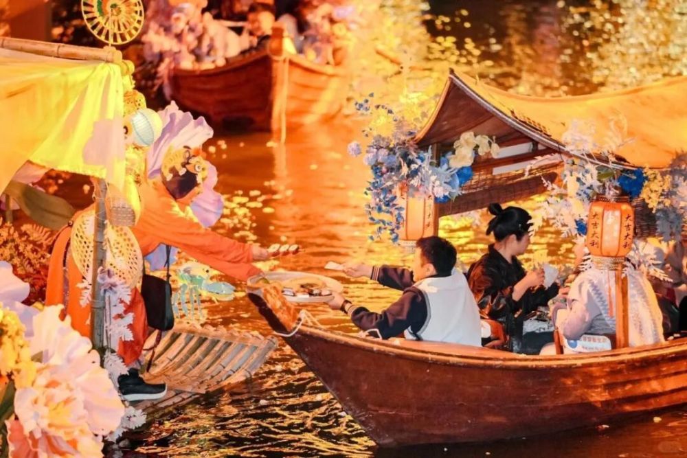 國(guó)慶中秋假期,每當(dāng)夜幕降臨,走進(jìn)昆明融創(chuàng)滇池后海就仿佛穿越到了古代的昆明。這里不僅有古色古香的滇池夜月表演,集市上還有身著漢服的攤販,使用“銀票”還可以和他們互動(dòng),沉浸式體驗(yàn)昆明歷史文化?!俺艘凰倚〈问幵诘岢厣?,看著岸邊燈火輝煌的古代與現(xiàn)代交融的風(fēng)貌,一句話形容就是‘太夢(mèng)幻了’!”剛從游船上下來的游客李小姐連連贊嘆。