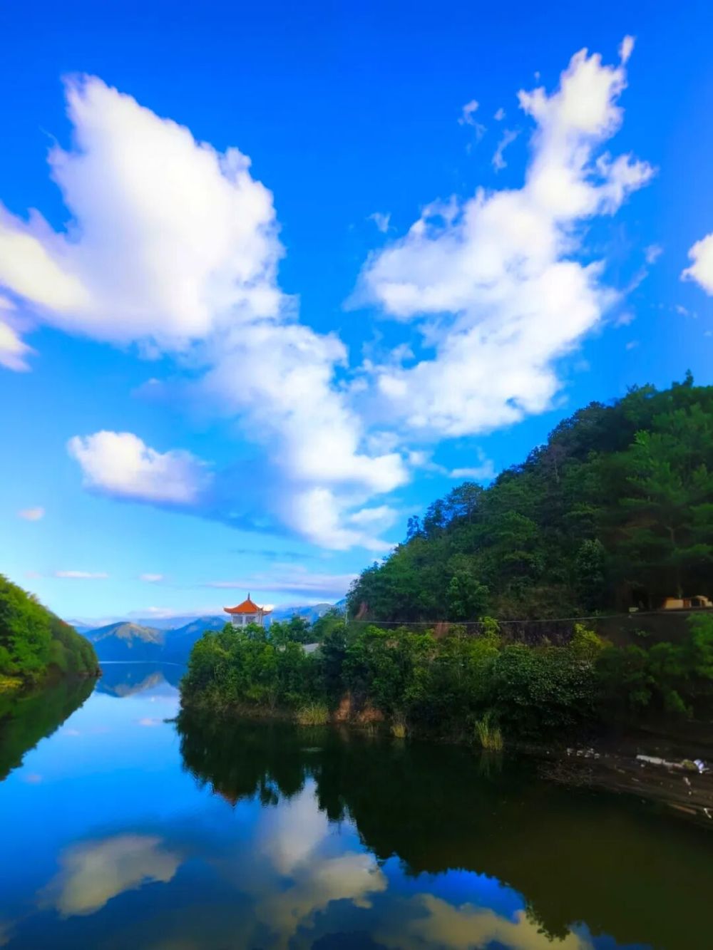 暮色漸濃時,夕陽為水庫鍍上暖橙光暈。湖心島的亭子藏在綠樹叢中,像美人發(fā)間的簪子,倒映在水中隨波輕晃。