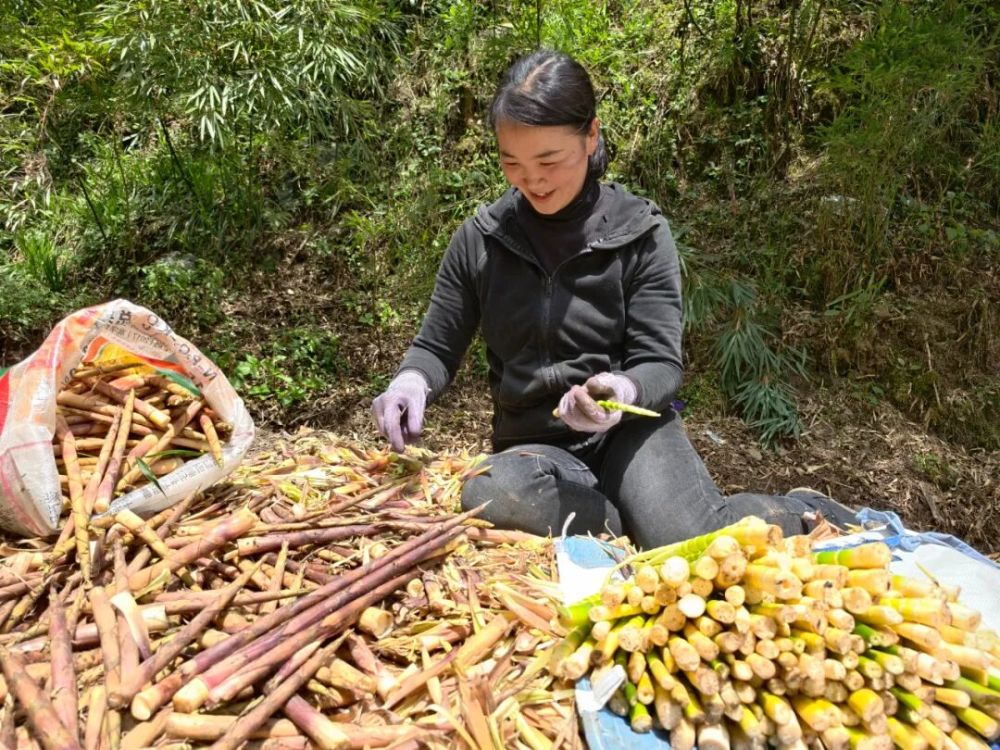 走進團結(jié)鄉(xiāng)新田村,郁郁蔥蔥的竹林順著山勢連綿起伏,一根根裹著淺褐絨衣的方竹筍破土冒尖。村民李昌書彎腰查看、伸手掰筍,動作嫻熟利落,“咔嚓”一聲脆響,新鮮的竹筍便落入背簍中。待得裝滿,他坐在竹林邊快速剝筍,褪去“絨衣”的筍肉潔白鮮嫩,不一會兒就裝滿了背簍。