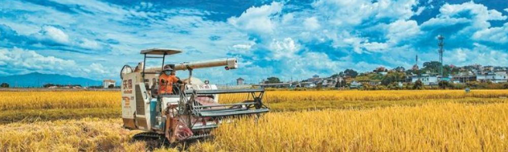 稻田里,一臺(tái)臺(tái)收割機(jī)正開(kāi)足馬力,在金色海洋中穿梭。所過(guò)之處,稻穗應(yīng)聲入倉(cāng),留下整齊的稻茬和彌漫的稻香。