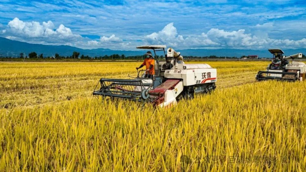 稻田里,一臺臺收割機正開足馬力,在金色海洋中穿梭。所過之處,稻穗應(yīng)聲入倉,留下整齊的稻茬和彌漫的稻香。