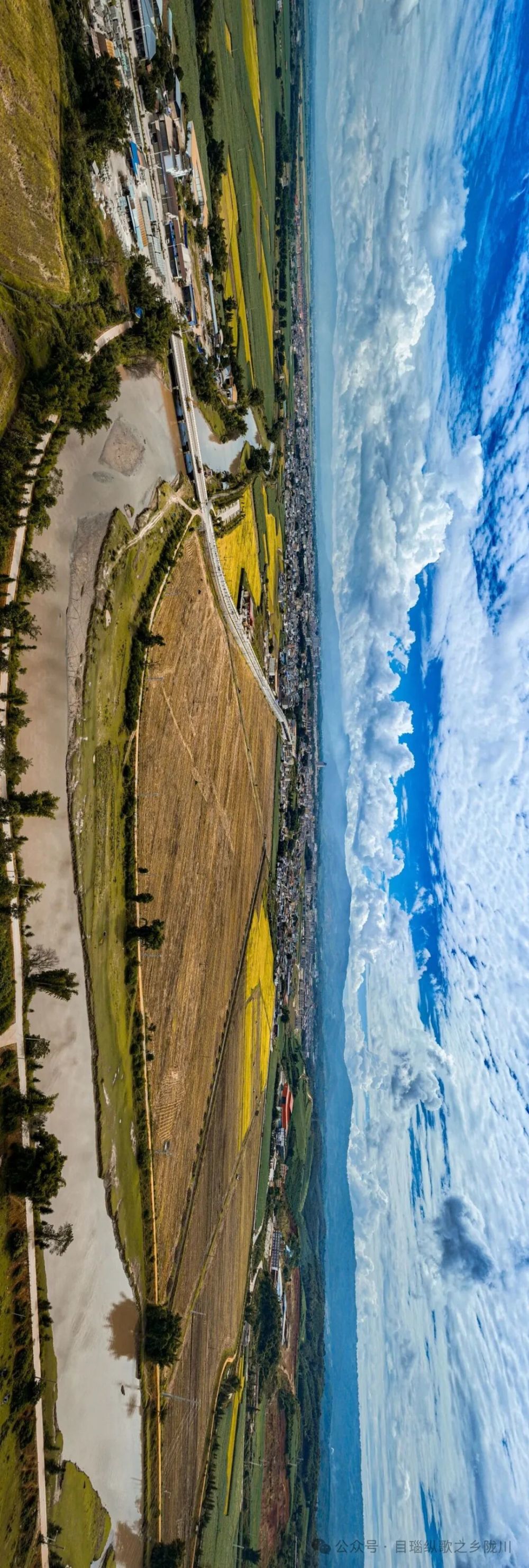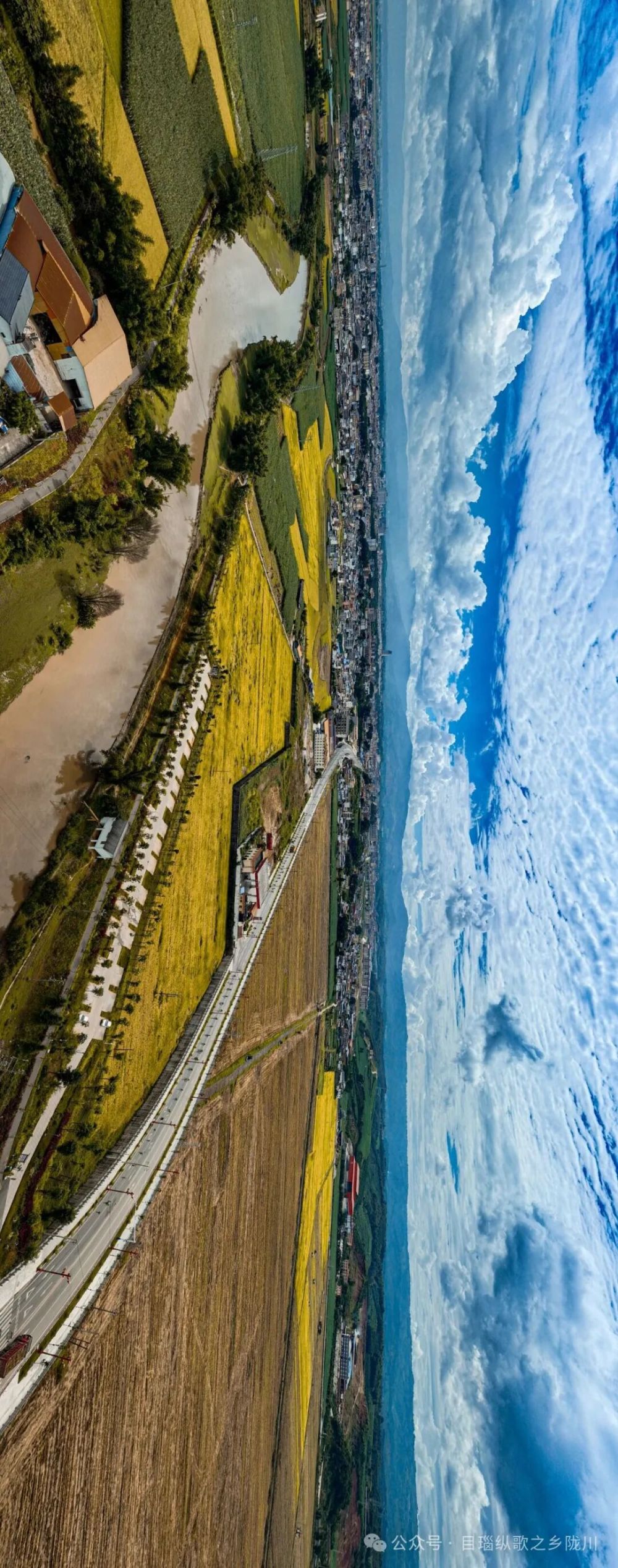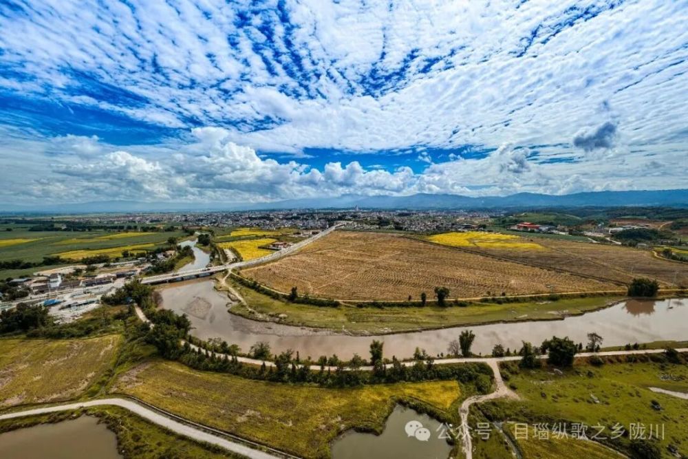 從空中俯瞰,隴川壩區(qū)宛如被打翻的調(diào)色盤。藍天白云為幕,萬畝稻田為毯,金黃的稻浪無邊無際,與村落、道路交織成一幅壯闊的田園油畫。