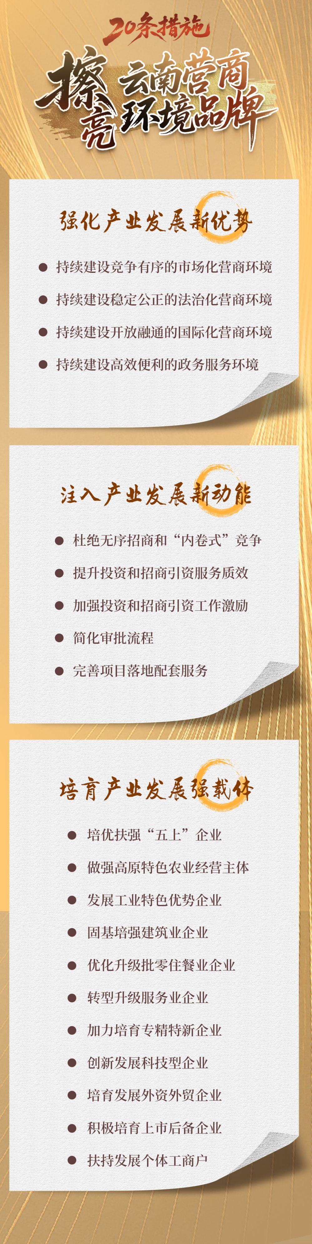 云南高度重視優(yōu)化營商環(huán)境工作,近年先后出臺《云南省打造一流營商環(huán)境三年行動計劃(2022—2024年)》《云南省營商環(huán)境全面提質(zhì)年行動方案》《云南省營商環(huán)境爭創(chuàng)一流行動方案》等系列政策措施,此次出臺《行動計劃2.0版》,將有力促進云南一體推進營商環(huán)境優(yōu)化、招商引資提質(zhì)、經(jīng)營主體引培,形成營商環(huán)境優(yōu)化與經(jīng)營主體健康發(fā)展互促共進的良性循環(huán)。